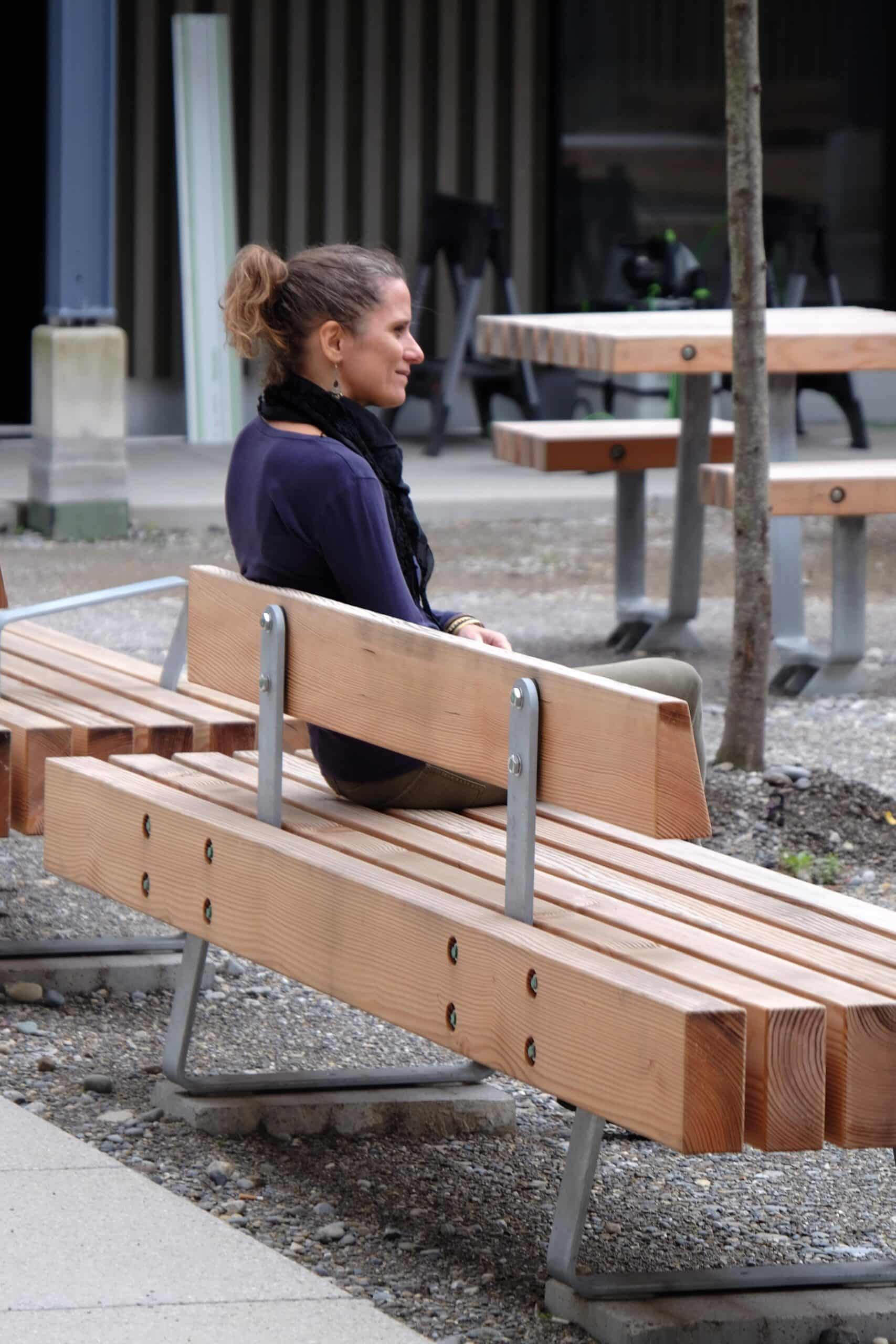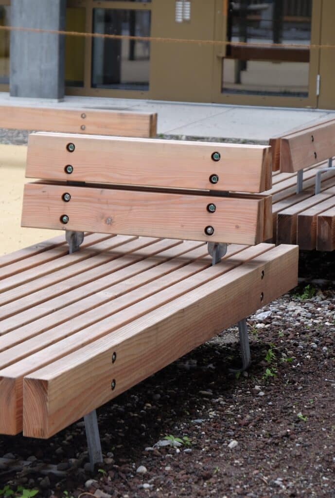 Das konstruktive Prinzip ist einfach und gut lesbar: unbehandelte Holzbalken werden auf Gewindestangen aufgefädelt, Stahl beschränkt sich auf Füsse und Verbindungselemente. Rückenlehnen, Armlehnen und Aufhängungen entstehen aus demselben System. Die Konstruktion ist nachvollziehbar, reparierbar und langlebig. Unbehandeltes Douglasienholz dient als CO₂ Speicher, der minimale Stahleinsatz reduziert Komplexität und Wartungsaufwand. Die Produktion bei Burri Public Elements in Zürich schliesst den lokalen Kreislauf.