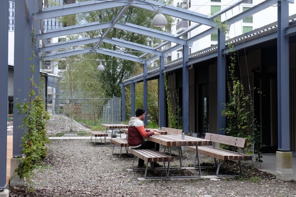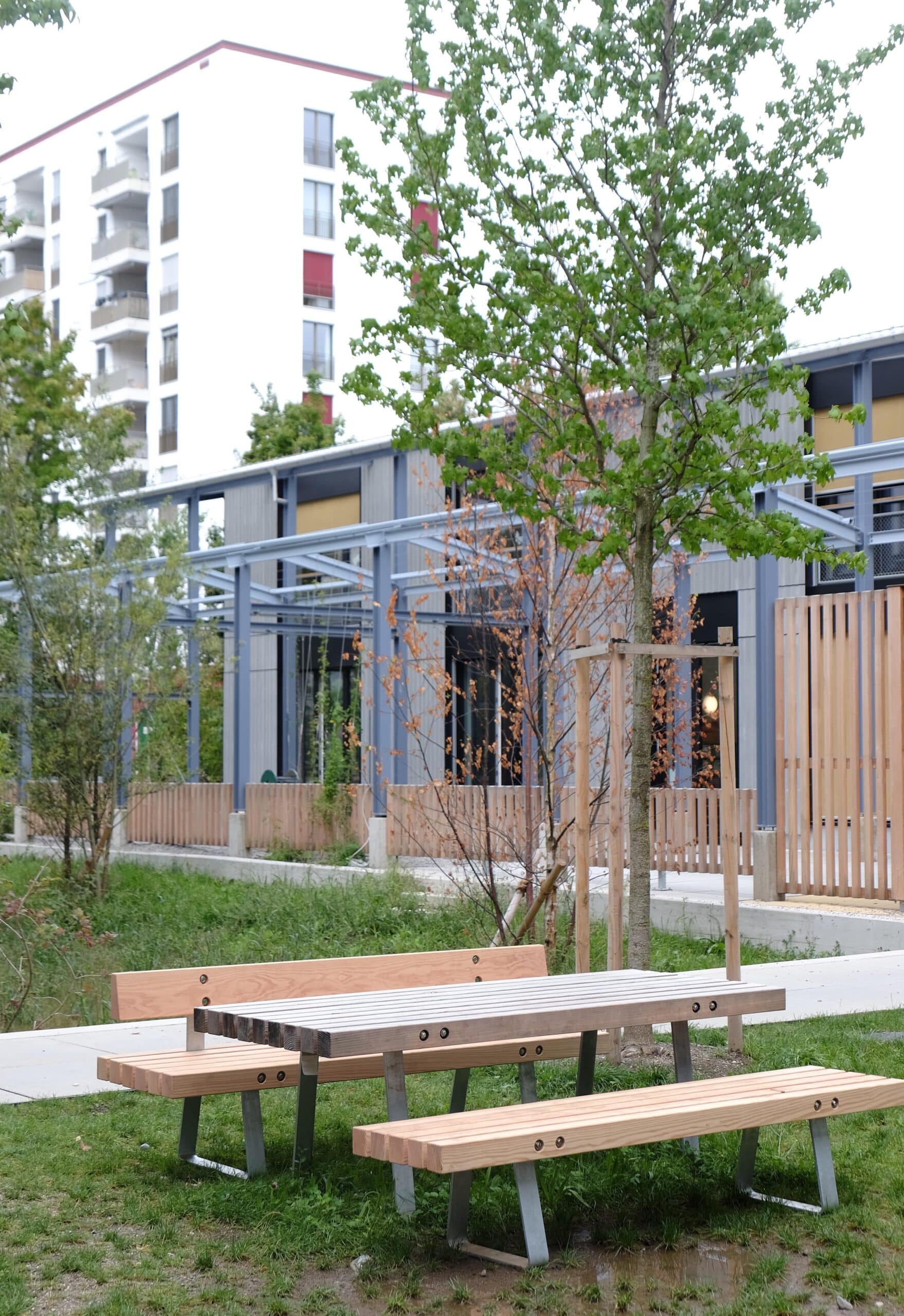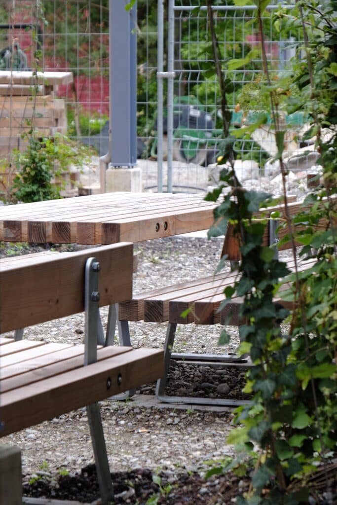 Die Möbelfamilie wurde spezifisch für die Aussenräume der Siedlung entwickelt. Ihr Massstab orientiert sich am Raster der Pergolen und ist bewusst grösser als bei üblichen Aussenraummöbeln, um Präsenz, Klarheit und Orientierung im Hof zu schaffen.