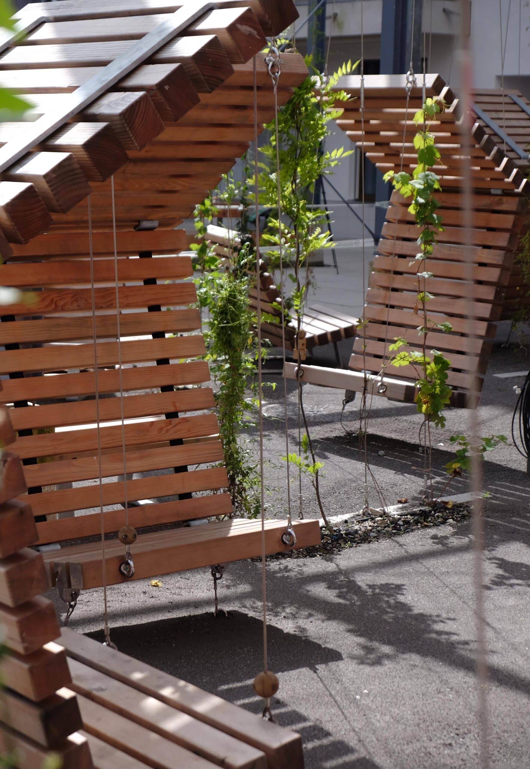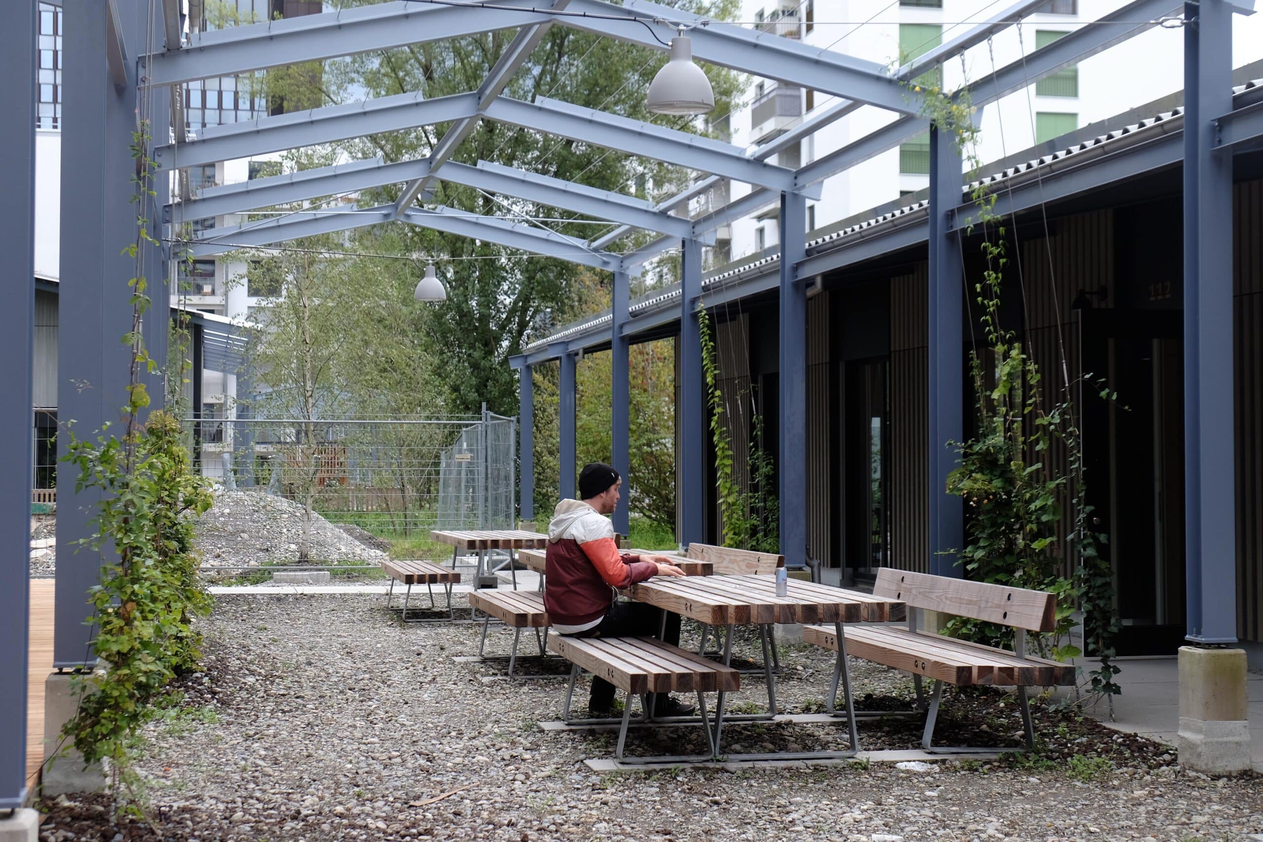 Pergolen aus Stahl strukturieren die Aussenräume, definieren Vorzonen und Eingänge und schaffen klar lesbare Gartenzimmer. Sie gliedern den Hof räumlich, reduzieren visuelle Unruhe und erzeugen überschaubare, wiedererkennbare Teilräume. Rankpflanzen übernehmen die Kühlung dort, wo aufgrund der Tiefgarage keine Bäume wachsen können.