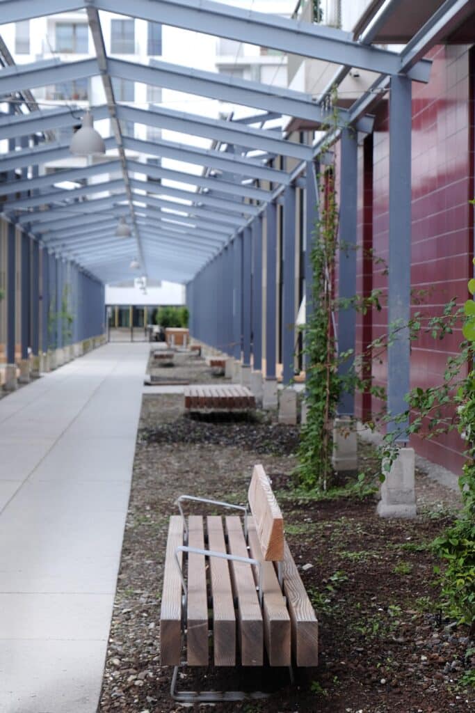 Die Auffädelmöbel und die Gartenzimmer sind Teil eines übergeordneten landschaftsarchitektonischen Konzepts und keine losgelösten Objekte. Sie wirken im Zusammenspiel mit Pergolen, Bepflanzung, Wegeführung und Raumabfolgen und sind als integrierte Elemente des Aussenraums gedacht. Gesundheit entsteht hier nicht durch Einzelmassnahmen, sondern durch das Zusammenwirken von Struktur, Massstab, Materialität und Nutzungsmöglichkeiten.