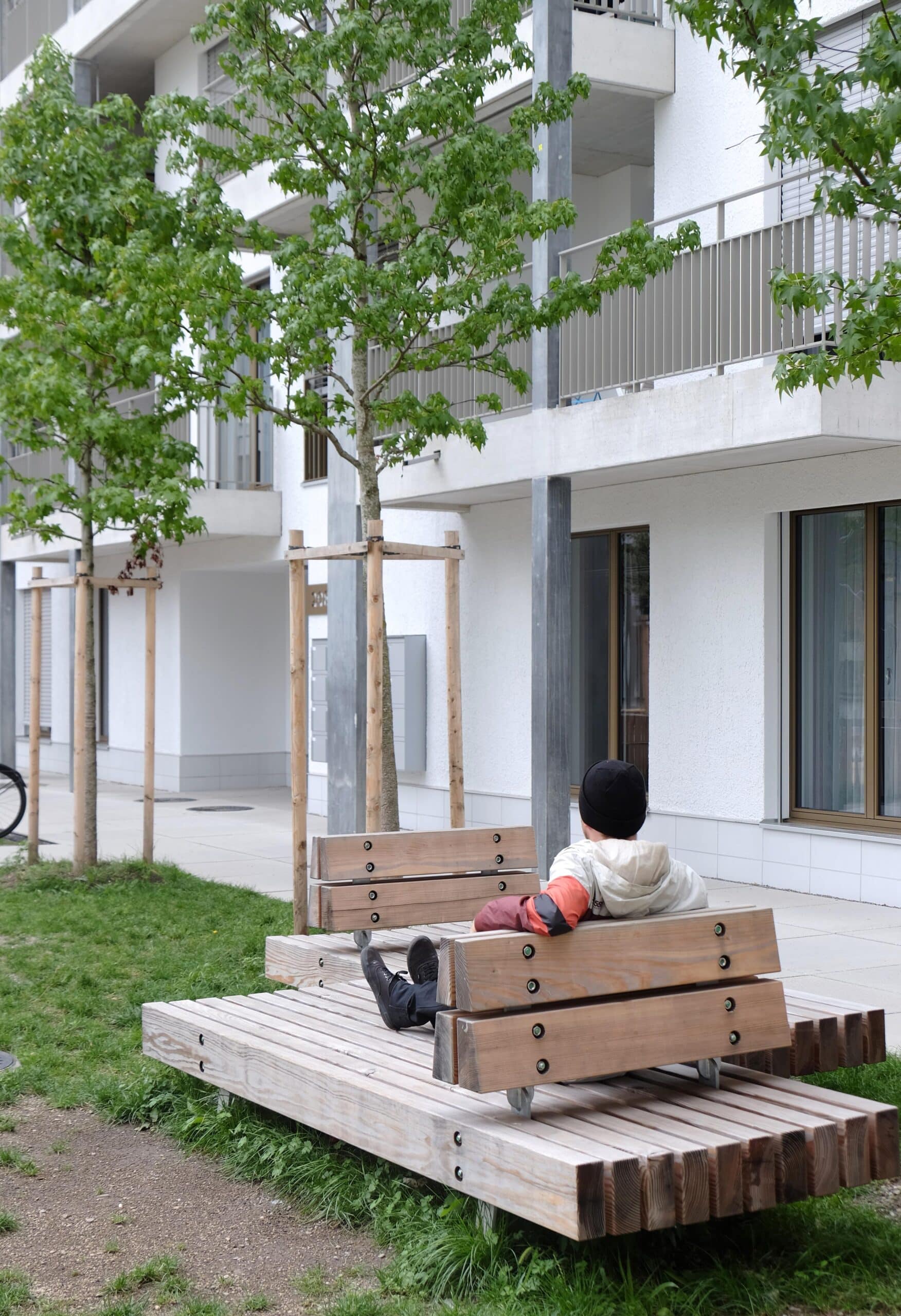 Kleine Sessel bieten Platz für zwei Personen, Tête à Tête Bänke erlauben Gespräch mit Distanz, schräge Liegen werden im Kindergarten altersgerecht zum Rutschen genutzt. Mobile Tische und Bänke lassen sich vor Gemeinschaftsräumen aneignen und wieder neu positionieren. Das System erlaubt individuelle Wahlmöglichkeiten, ohne den Raum zu überladen oder zu fragmentieren.