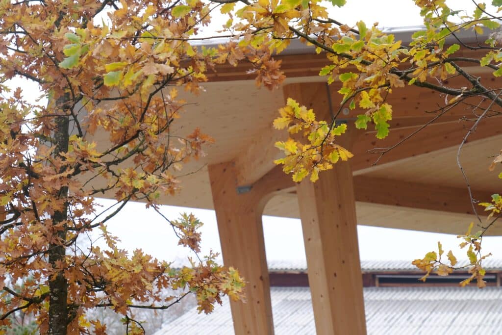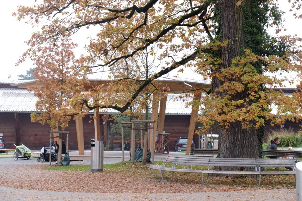 Im Stadtgarten Uster ist der Herbst spürbar. Goldbraune Blätter wirbeln über die Wege, rascheln im Wind und antworten auf die Farbe des Pavillons. Seine unbehandelten Holzstützen greifen das Licht auf, das durch die Baumkronen fällt – ein offener Ort, zugänglich und gemeinschaftlich.
