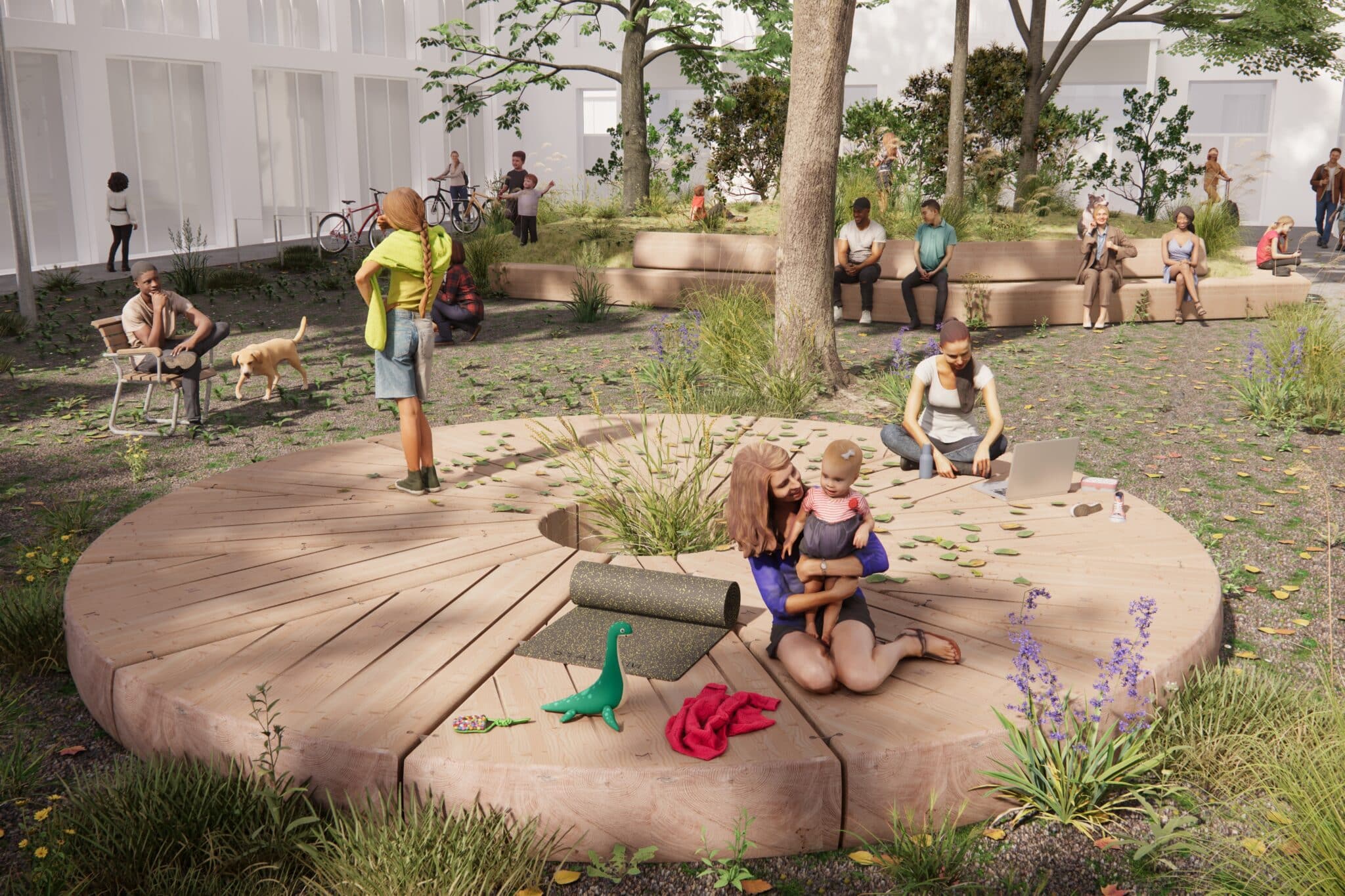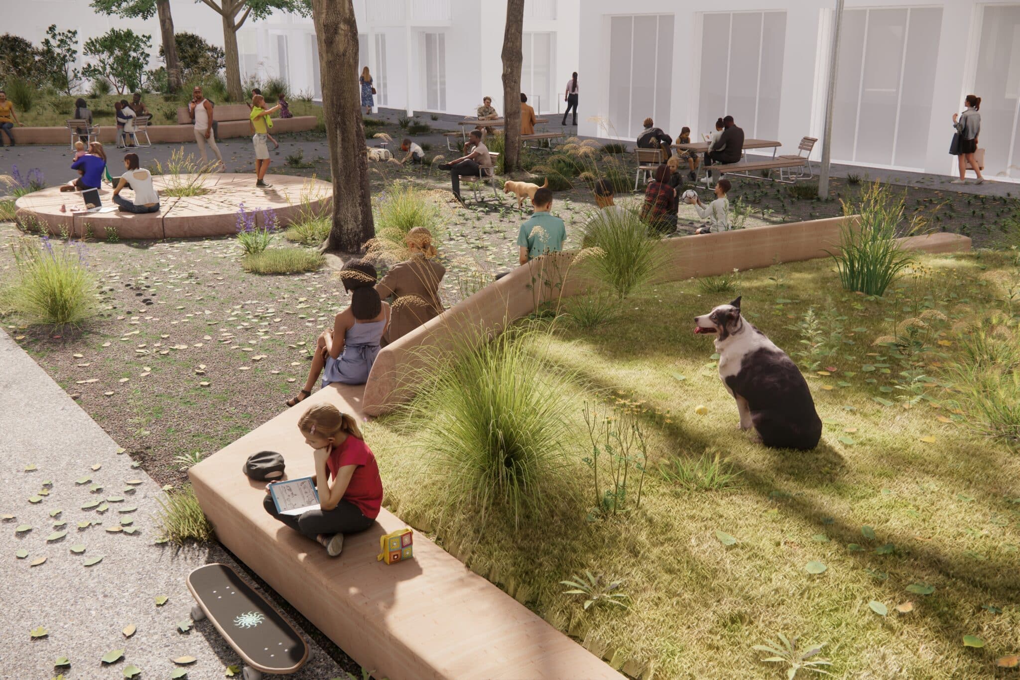 Zentrales Element sind grossformatige Sitzbalken, die Teil eines ökologischen Kreislaufsystems sind und in das landschaftliche Konzept integriert sind. Die massiven Vollholzelemente definieren Räume, dienen als Stützmauern und schaffen Aufenthaltsorte im Alltag. Durch ihre Dimension und Geometrie entstehen vielfältige Nutzungsmöglichkeiten – vom Sitzen und Liegen bis hin zu Spiel und spontaner Aneignung durch unterschiedliche Altersgruppen.