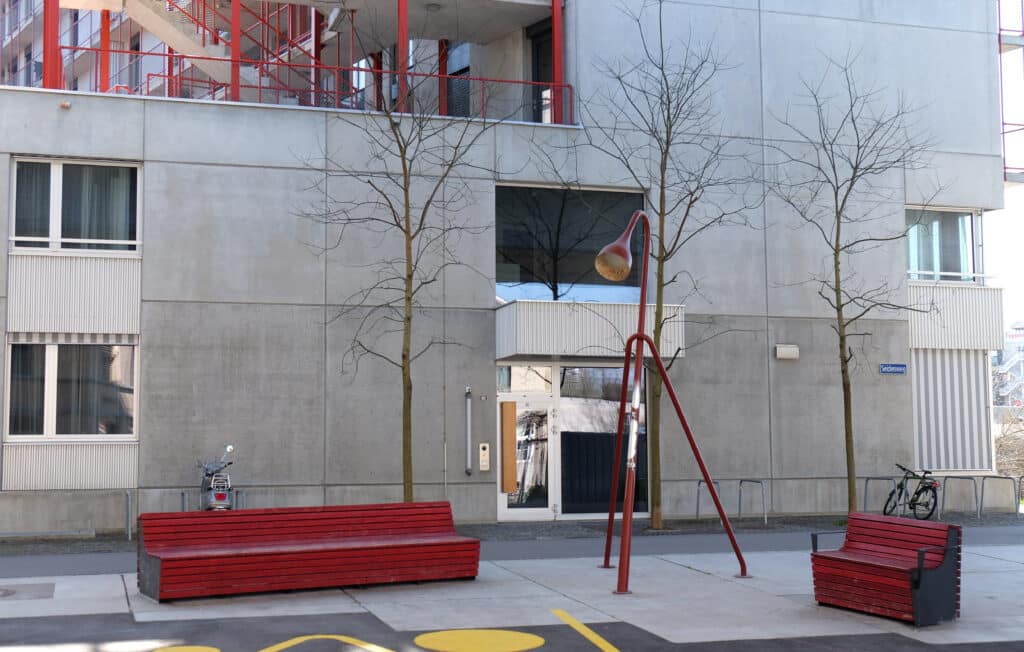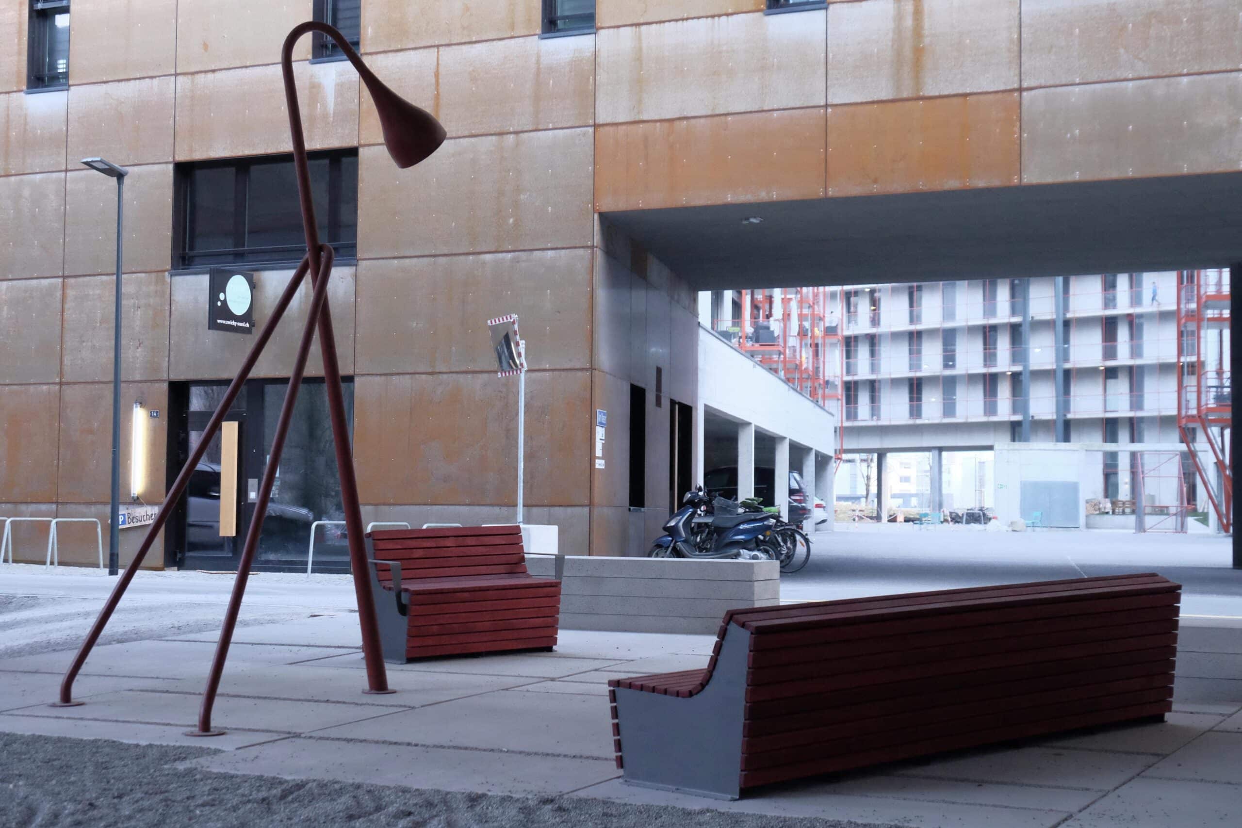 Das Zwicky Areal in Wallisellen verbindet durch einen neuen Park die beiden Teile des Gebiets unter einem Brückenviadukt. In diesem kalten, von Beton geprägten Raum wurde eine Aufenthaltsinsel geschaffen, die mit warmer Farbgebung und klaren Formen zum Verweilen einlädt. Die Sitzgruppe, bestehend aus Sofa, Sessel und Leuchte, wurde zwischen 2016 und 2017 von Studio Vulkan Landschaftsarchitekten entworfen und von Burri Public Elements AG produziert.