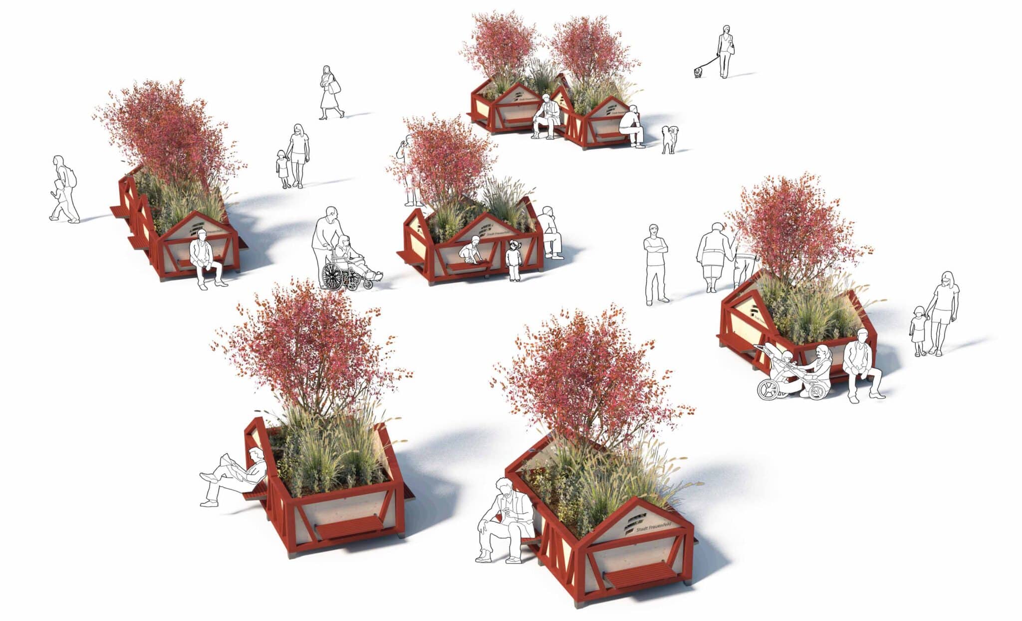 Aus dem Pflanztrog wachsen farbenfrohe Pflanzen, die für Frische und Lebendigkeit sorgen. Zusätzlich ist der Trog allseitig nutzbar: Klappbare Bänke laden Passanten zum Verweilen, Ausruhen und Betrachten der Umgebung ein. Diese kleinen Häuser werden so zu multifunktionalen Gestaltungselementen, die nicht nur gut transportierbar sind, sondern auch aktiv zur Steigerung der Aufenthaltsqualität beitragen.
