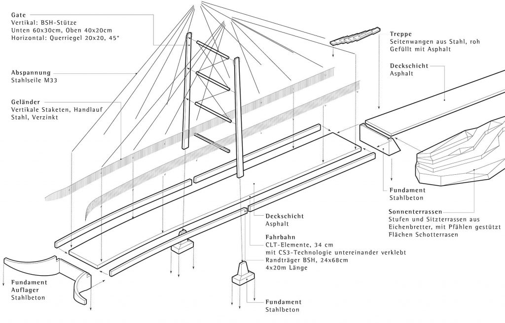 Der Boostocksteg setzt auf eine innovative Kombination aus Holz und ultrahochfestem Beton. Die Hauptkonstruktion besteht aus Cross-Laminated Timber (CLT), das durch seine leichte, aber robuste Bauweise beeindruckt. Der Betonbelag sorgt für eine langlebige, wartungsarme Oberfläche. Diese Materialwahl minimiert den CO₂-Fußabdruck und trägt zur Nachhaltigkeit des Projekts bei.