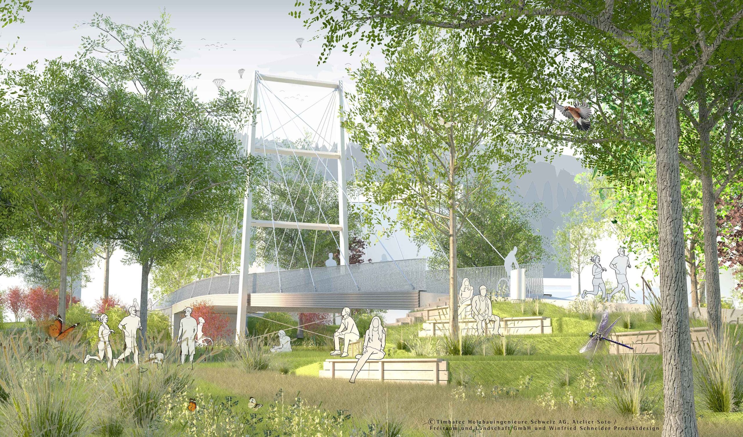 Der Steg fungiert nicht nur als Brücke, sondern auch als Verbindung zwischen städtischen und natürlichen Lebensräumen. Großkronige Bäume, Wildblumenwiesen und Heckenkissen prägen den angrenzenden Park, der einen wertvollen Beitrag zur Biodiversität und Hitzeminderung leistet. Die klare Gestaltung der Wege und die direkte Anbindung an das Quartier Langäcker fördern den Langsamverkehr und erhöhen die Aufenthaltsqualität für die Bevölkerung.