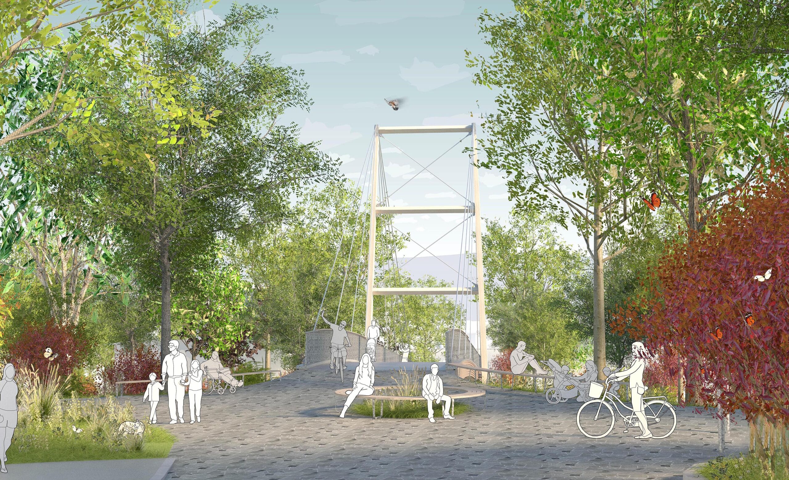 Am Auftakt des Stegs entsteht ein Quartiersplatz, der als nachbarschaftlicher Treffpunkt und zentraler Knotenpunkt für den Langsamverkehr dient. Mit Sitzbänken, einem Wasserelement und großzügigen Baumpflanzungen wird der Platz zu einem Ort des Austauschs, der Entspannung und der Begegnung für alle Generationen.